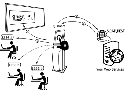 Q-smart növbə idarəetmə sisteminin təyin sorğusu prosesini xarici sistemə yönləndirə bilərsiniz. Növbənin idarə edilməsi sistemi müştərinizin daxil etdiyi görüş nömrəsini veb xidmət zəngi etməklə cari görüş sisteminizə göndərir. Veb xidmətinizdən JSON formatında cavaba əsasən, sistem müştərinizin biletini çap edir və onu prioritet olaraq çağırır.