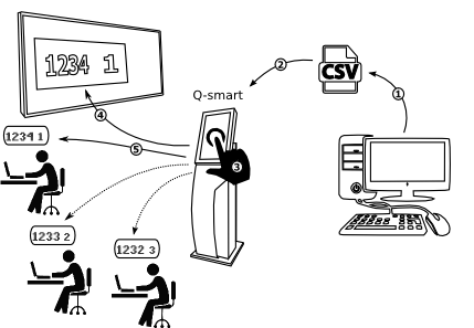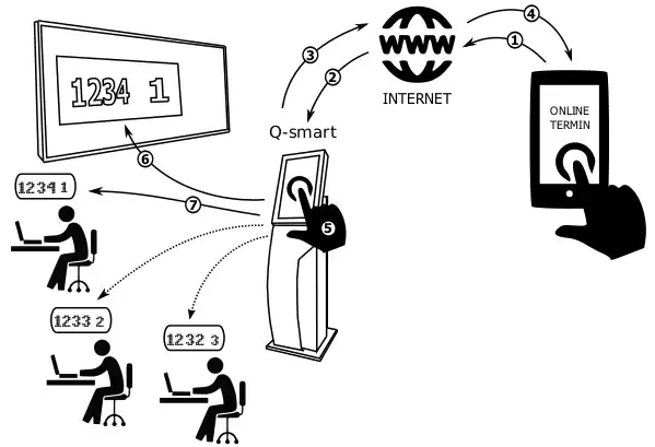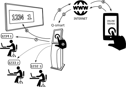 Q-smart növbə idarəetmə sistemi inteqrasiya olunmuş veb server və görüş veb səhifəsi ilə hazır təklif olunur. Müştəriniz göstərdiyiniz URL-dən (1+2) İnternetə qoşulmuş bilet aparatınıza qoşulur.