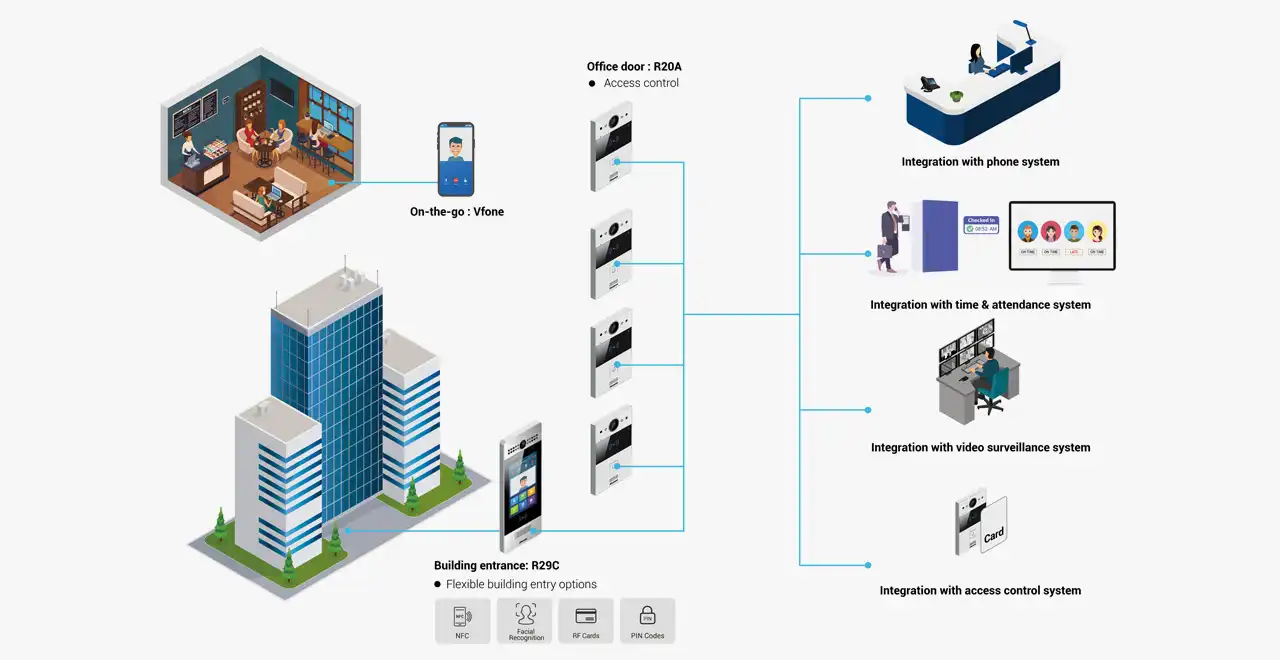 RS485 və Wiegand-ı dəstəkləyən qapı telefonu mövcud girişə nəzarət sistemi ilə işləyə bilər. Təsdiqlənmiş məlumatlar qapı telefonundan qapı girişinə icazə vermək üçün artıq mövcud olan giriş nəzarətçisinə ötürüləcək. Ağıllı interkom həmçinin müxtəlif autentifikasiya üsullarını təklif edir, o cümlədən RFID kartların sürüşdürülməsi, şəxsi parolun daxil edilməsi, proqramdan istifadə və ya hətta sifətin tanınması vasitəsilə işçi heyətin iş yerində hərəkət etməsini çox asanlaşdırır.