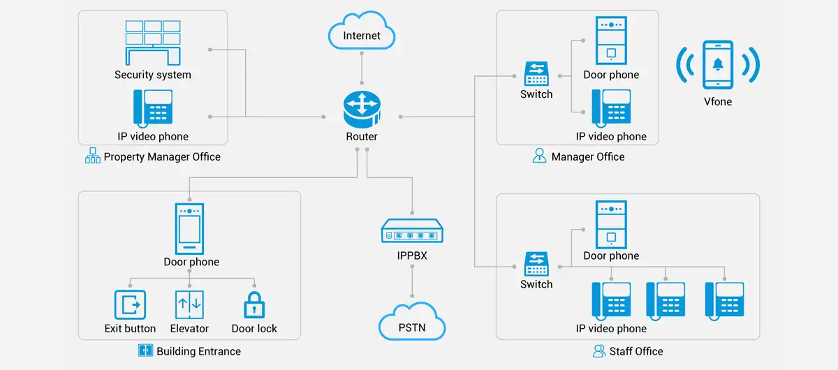 Smart interkom SIP-ə əsaslanır və mövcud telefon sistemi kimi istənilən SIP dəstəkləyən sistemlər arasında əlaqə yaratmağa imkan verir. Bu, işçilər, ziyarətçilər, təhlükəsizlik işçiləri və xidmət təminatçıları üçün limitsiz rabitə təklif edir.